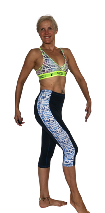 3/4 legíny z príjemného funkčného materiálu. V páse čierna guma ViGi. Celé sú preštepované žltou neonovou niťou.